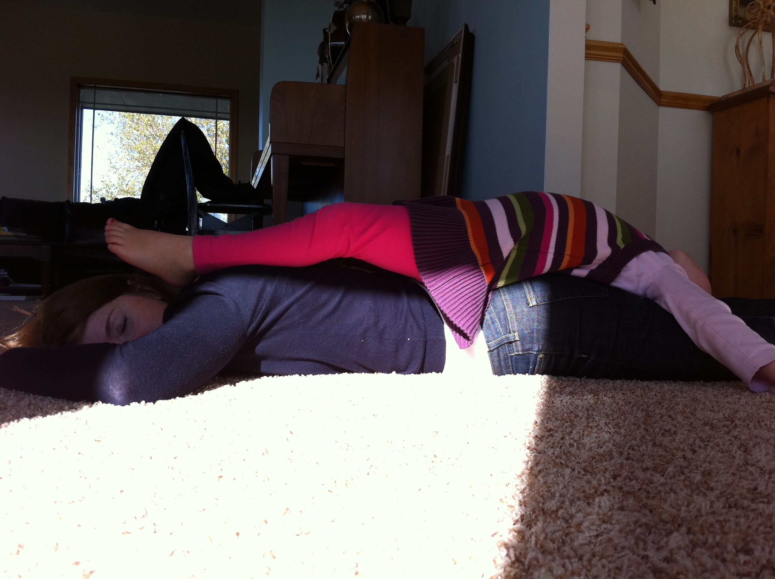 Shortly after the airplane scene, we were laying on the carpet like cats in pools of sunshine.  She crept over to me army-style, and started whispering.  Wendy, her mom (Mike’s sister), was sitting across the room listening to the kid-whisper that’s never really a whisper, because it can be heard from 10 feet away.