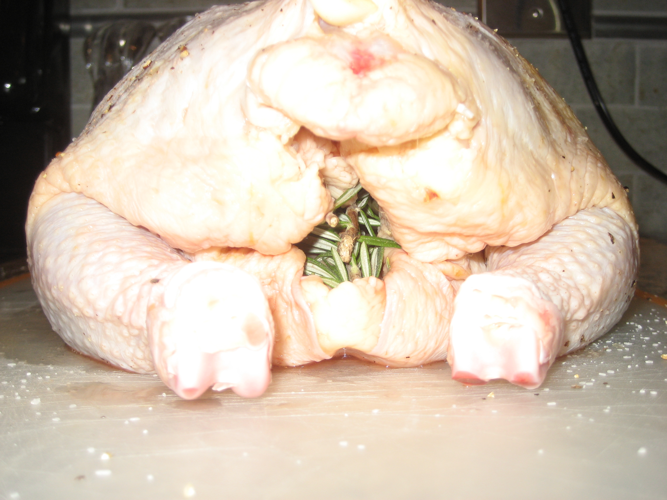 I became a huge fan of rosemary in the process, because I quickly discovered that I can jam it into the chicken without ever touching the slimy flesh.
