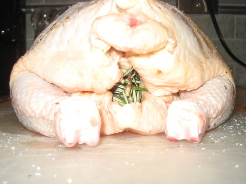 I promptly threw them in the trash and then washed my hands within an inch of their life.  Only I should have kept reading because it wasn’t long before I was rubbing salt and pepper all over the bad bird and then shoving a lemon up his rear.   Good times.