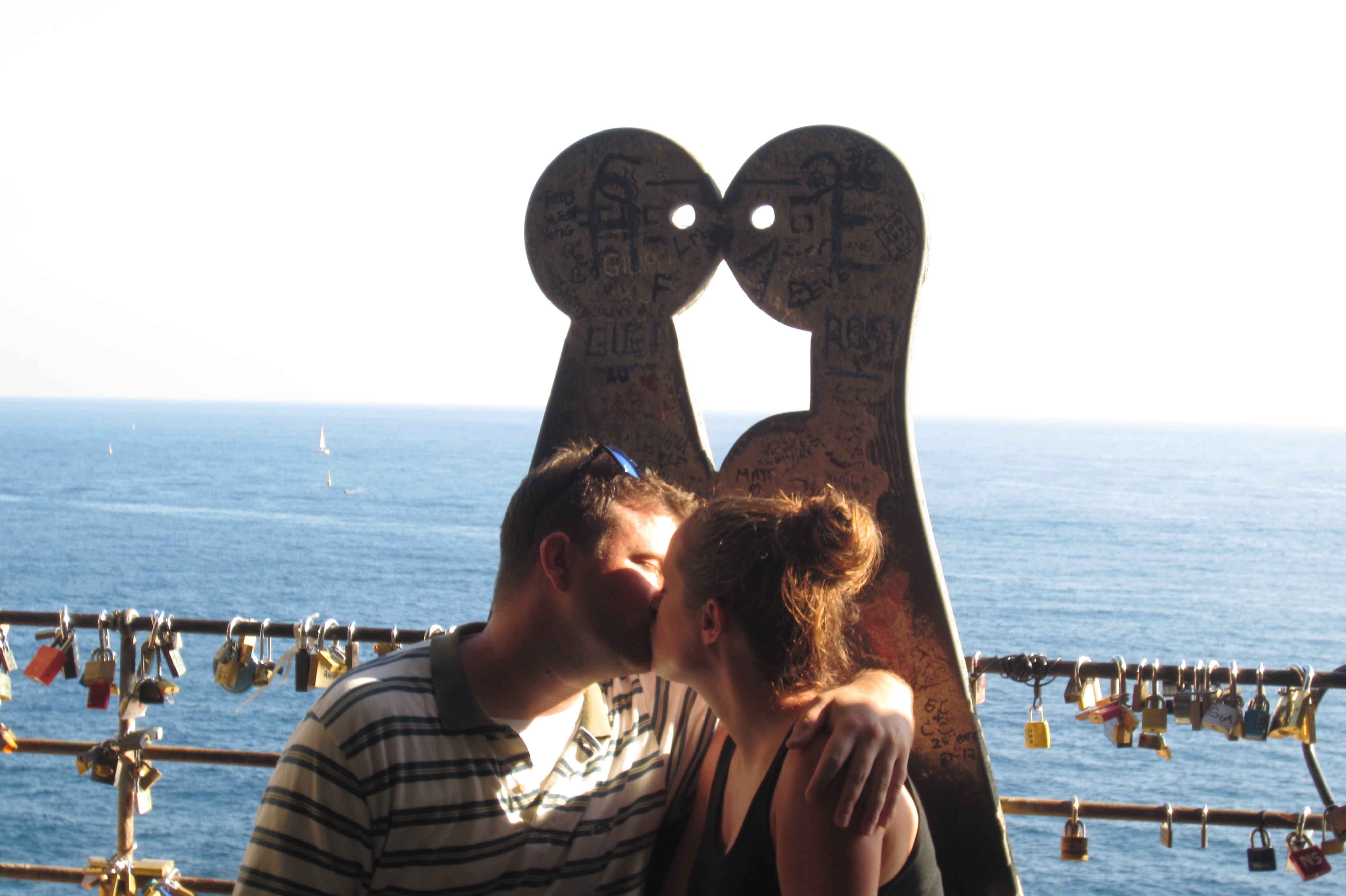 Our last destination was Riomaggiore, or as we nicknamed it, Rigamortis. The path along the hillside to walk there is called Via dell’Amore, or The Way of Love. It’s a famous place for lovers to walk the kilometer-long road and take in the spectacular view and dedicate their love by putting a lock into the fence (Sam and Aaron did this on their walk with Dave and Nancy). Mike and I took a photo there in 2009 and decided to recreate the moment in 2012.